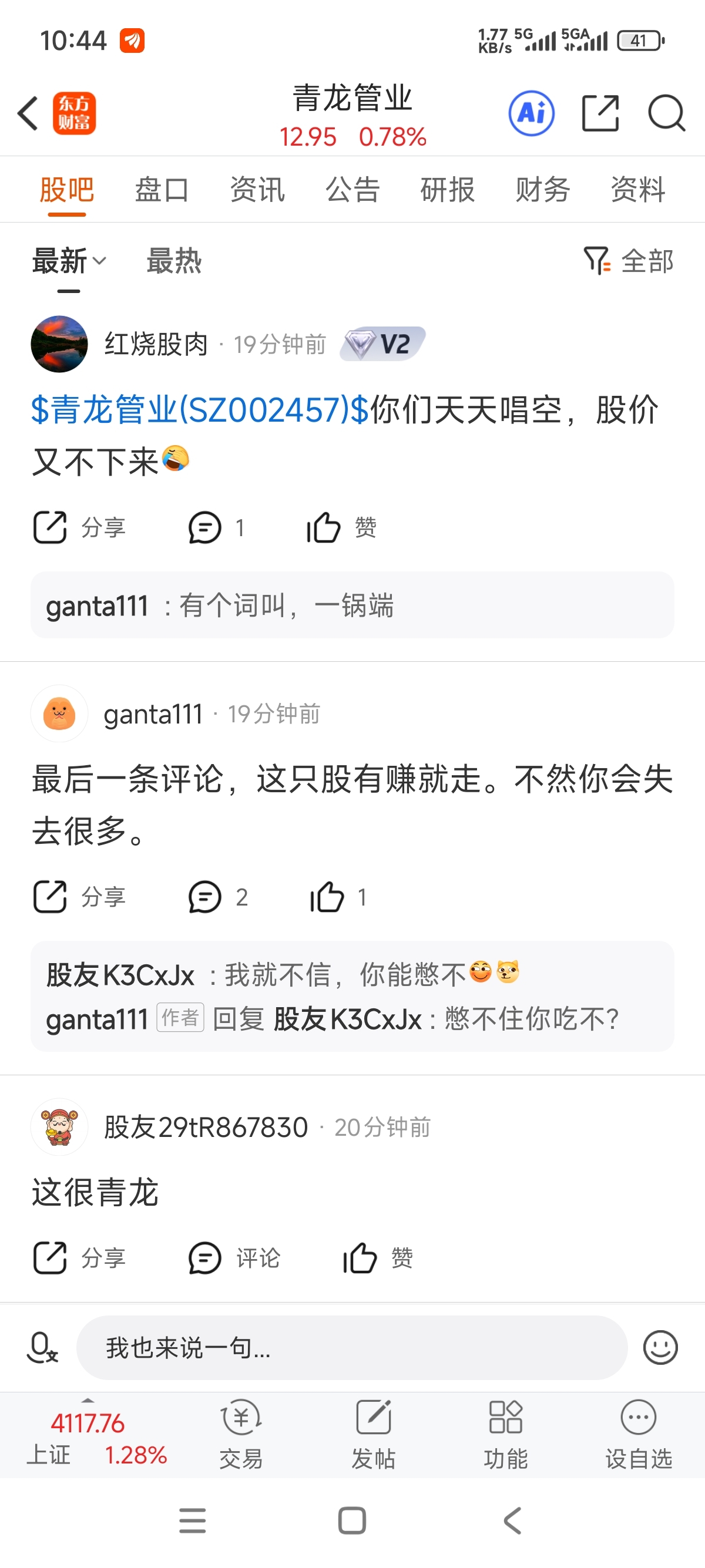 温馨提示: 1.根据《证券法》规定,禁止编造、传播虚假信息或者误导性信息,扰乱证券市场;2.用户在本社区发表的所有资料、言论等仅代表个人观点,与本网站立场无关,不对您构成任何投资建议。用户应基于自己的独立判断,自行决定证券投资并承担相应风险。《东方财富社区管理规定》