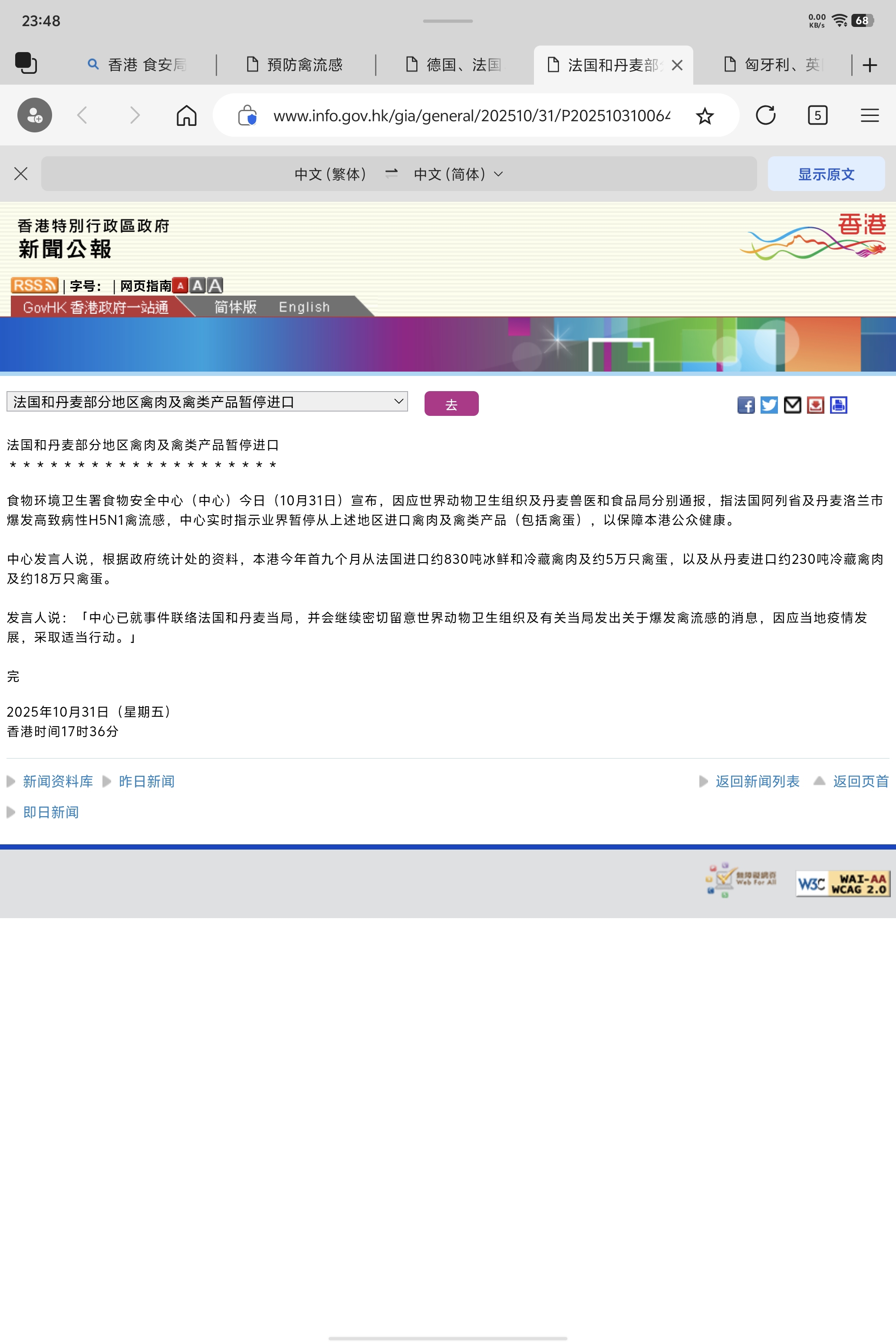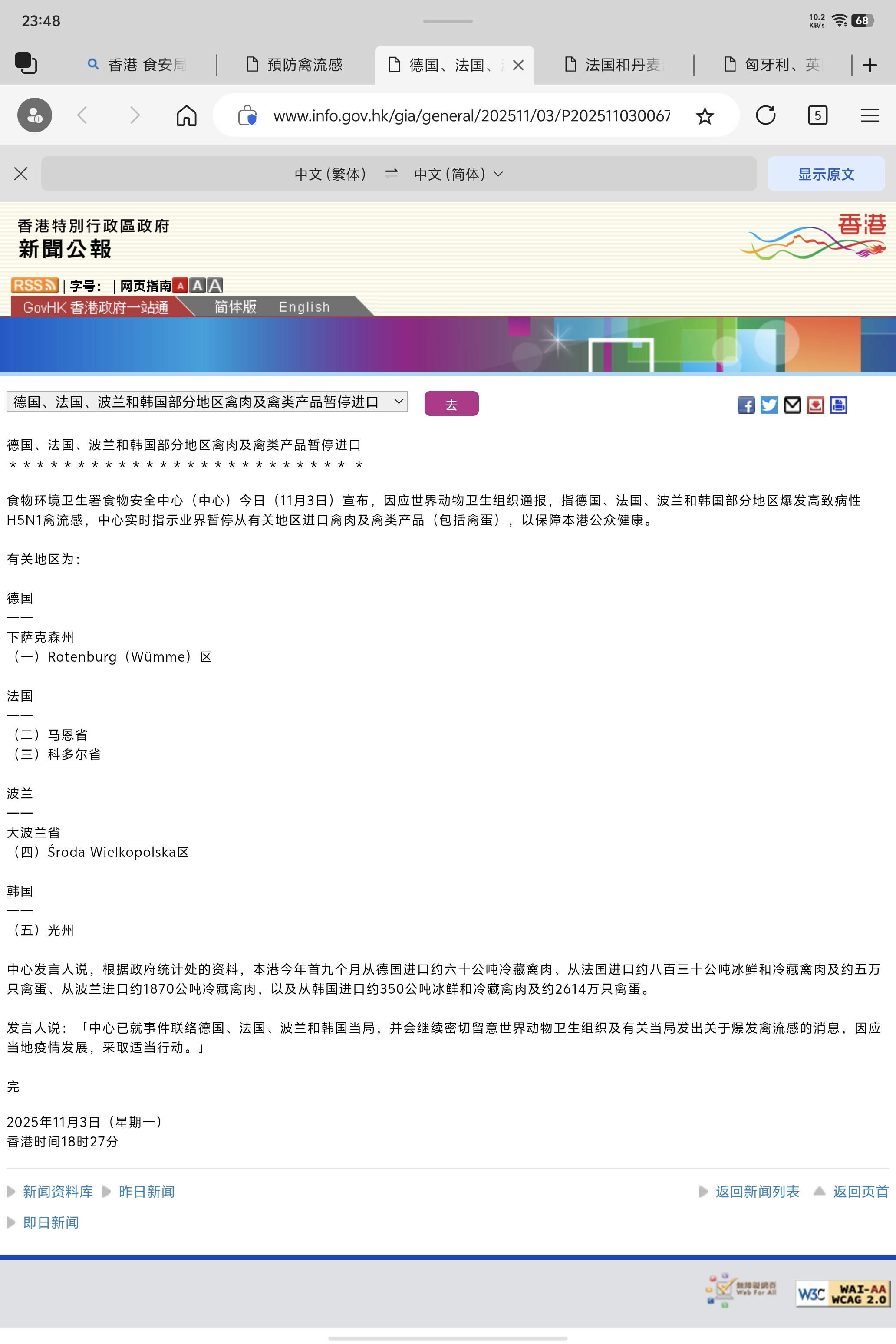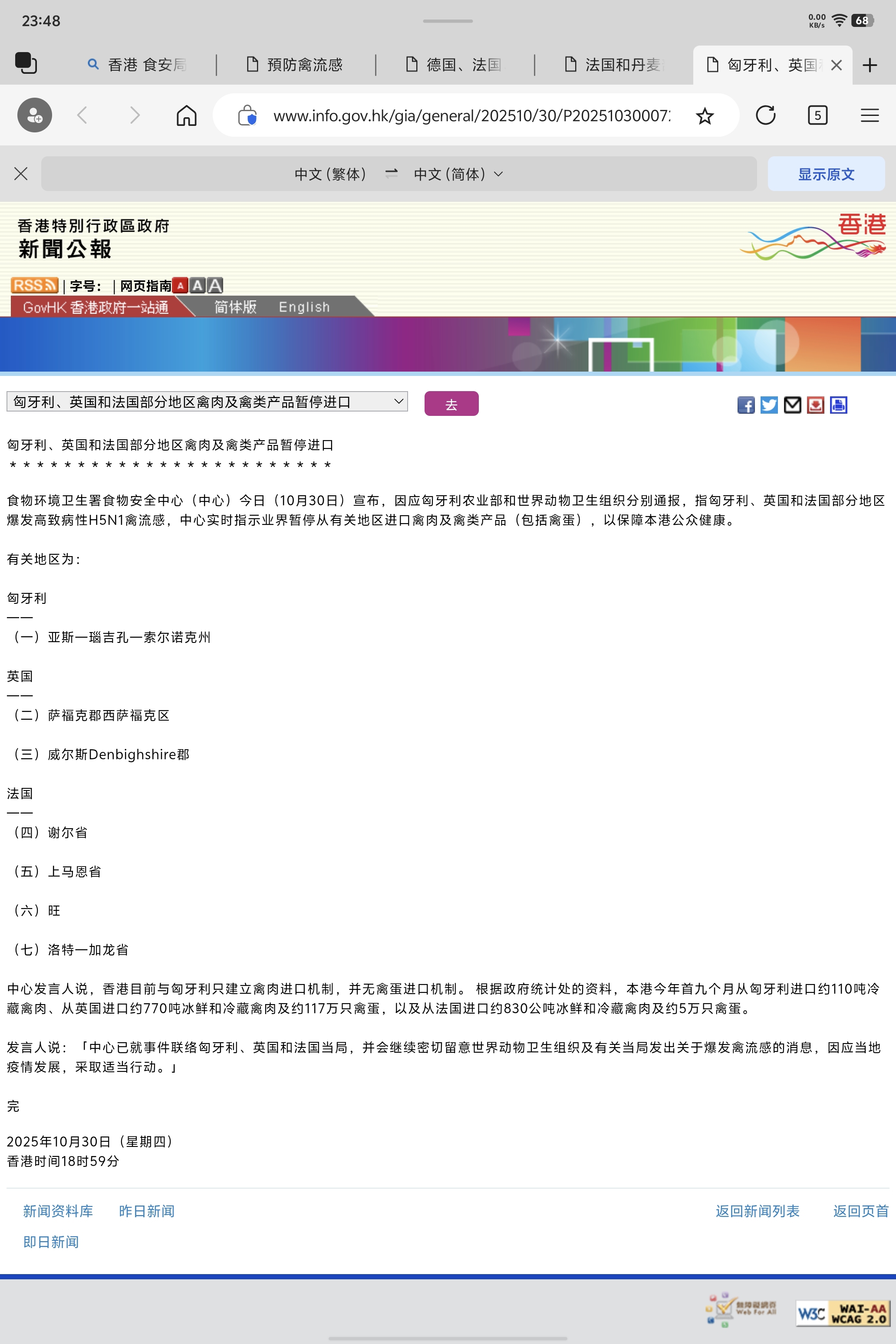 $益生股份(SZ002458)$ $民和股份(SZ002234)$ $圣农发展(SZ002299)$ 法国11月3日、10月31日、10月30日这几天,报告了6个省的禽流感疫情。马恩省、科多尔省、阿列省、谢尔省、上马恩省、旺代省、洛特-加龙省。