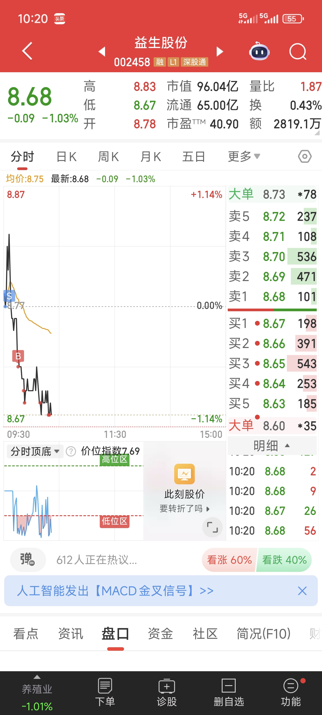 $益生股份(SZ002458)$ 今天开盘卖了做t陆续接回,目前已接十分之二仓位,接完继续锁仓,