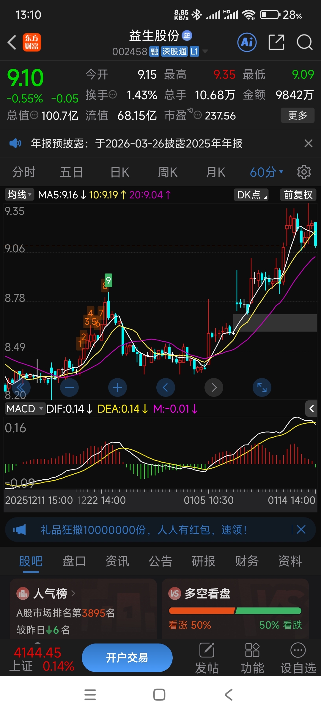 $益生股份(SZ002458)$ 60分钟高位死叉,买什么啊