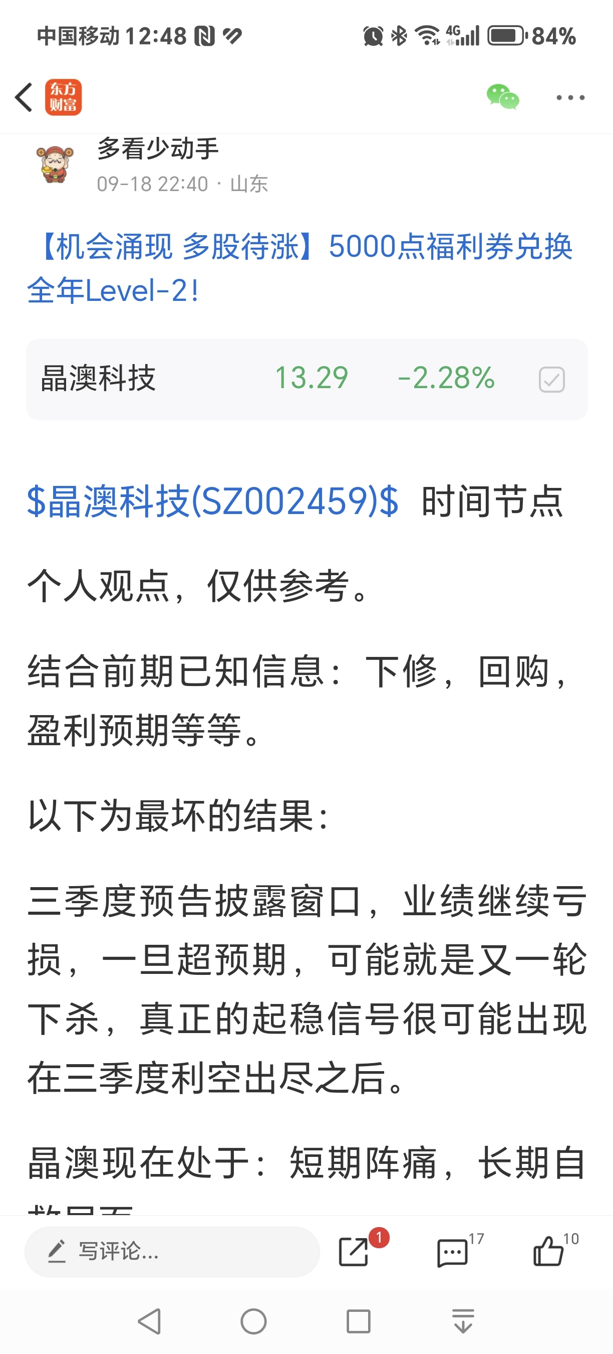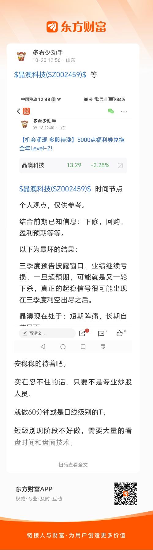 本月没有一点想进攻的欲望。除去做两个避险防御板块:保险(节日持股)和白水,就双良节能参与一次进攻博弈快进快出就撤出了。其余时间都在等待或是挂低点买盘,能成就做,不成交就继续等呗。个人观点还是先看回落,回落点暂时可以把大盘60分钟的缺口看为强弱分界线,冲击前期高点主要看能不能带量冲击,带量还有一定空间,不然还要回落测试。至于这次是反弹还是向上冲击,这个要走一步看一步,真不清楚。个人偏向于反弹,力度要根据当天盘面变化判断。至于晶澳有人说价位被套,就不一一回复了,高点以下,只要仓位和资金占比不大的话,就老实实待着别割肉就行,能回去,但需要时间,至于多久我没有未卜先知的本事,真不知道,要先看三季度报减亏或是毛利率有所回升可能会快点和大盘后面什么走势才行。确实被套着难受手痒,就根据60分钟或是日线做做,短级别除非你有大量时间看盘和盘面感就做,近期短级别确实不太好做。被套的真正原因要从自身先找,是不是自身问题。止盈止损一定要严格执行,千万千万别怕错过,再就是一定要相信自己,不能乱跟风,因为你不清楚别人的仓位成本是多少,也不清楚别人的操作执行习惯。很多人做晶澳看到低点就恨不得全仓进去,生怕自己错过好几百万一样,股票最忌讳就是全仓,全仓≈割肉。13.40-13.50左右看看能不能带量冲过去,不然可能还回来继续磨。说句不中听的话:现在被套的,要么割肉要么等,没有其他选择,挣钱不易,不如等等。出去也未必能有盈利。沉住气,别贪,别急,保持好心态,做好止盈止损,该加就加点,该减的时候就要减减,千万千万别怕错过机会,股市一天不关门,机会就会有很多。晶澳个人属于看长线做短中线,资金有限就是挣点支撑位和压力位之间的利润,能做成功最好,做不了就做其他或是等待。做股票说白了就是投机取巧,要先学会等待和耐得住寂寞才行。