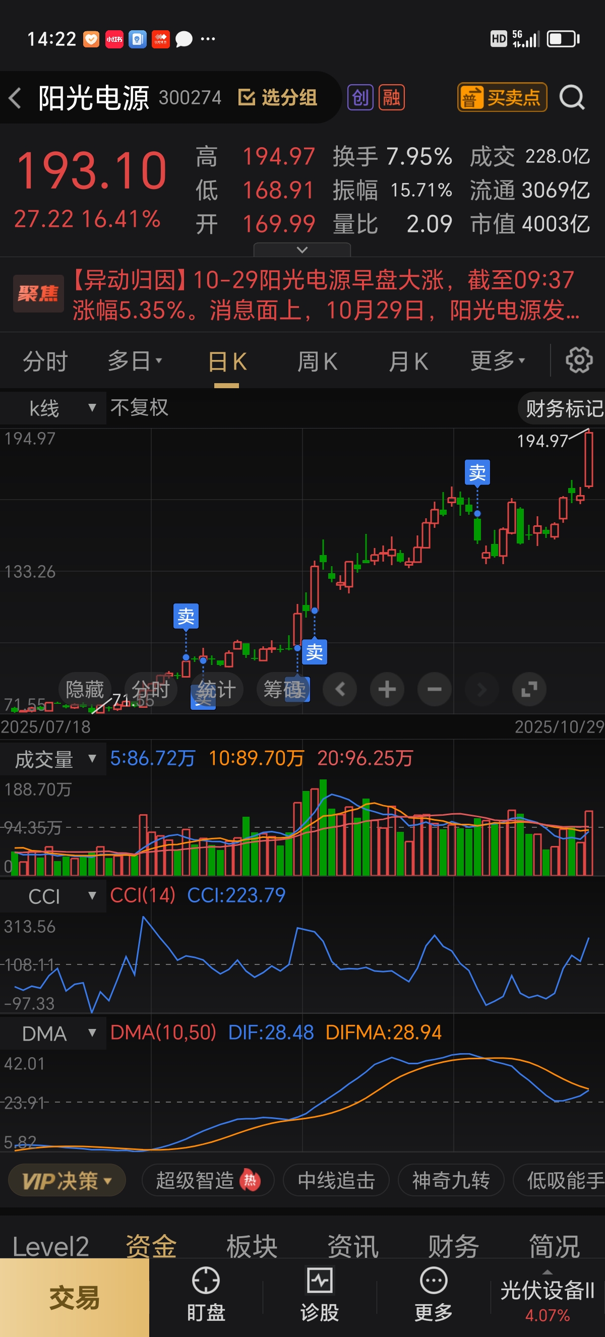 走势来了,不要急着卖,阳光电源我60元买的,一路涨一路卖,涨到130元剩下100
