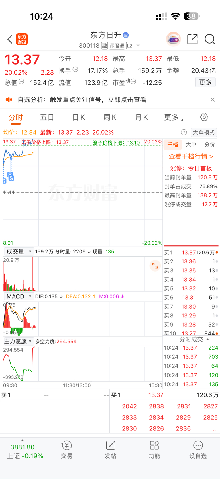 上周五全仓买进东方日升,今天卖飞。我今日再来买进晶澳