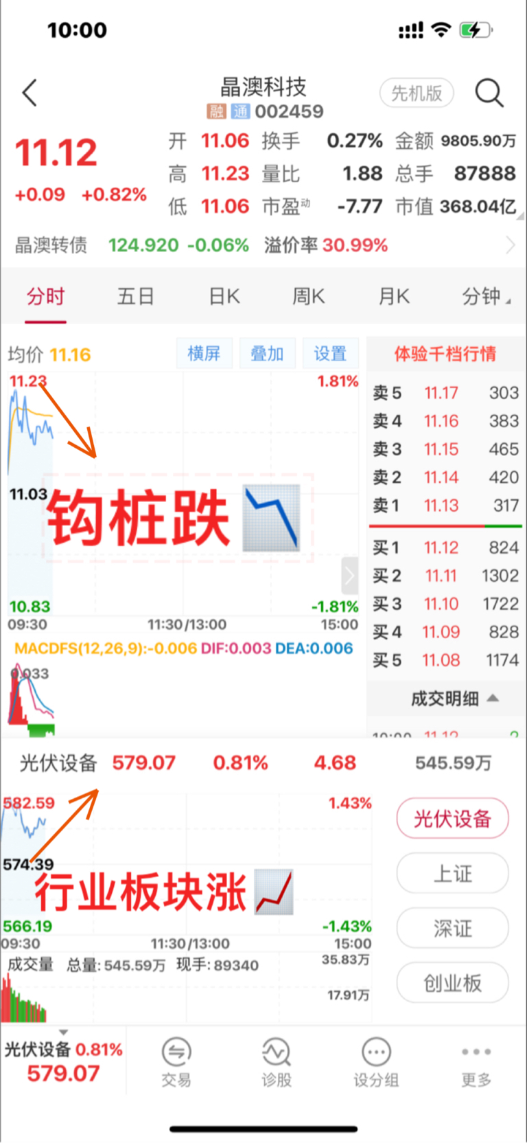 看图说话钩桩独有特点!一个多月了快2个月了每天都是这么走势!行业板块涨晶澳太阳能