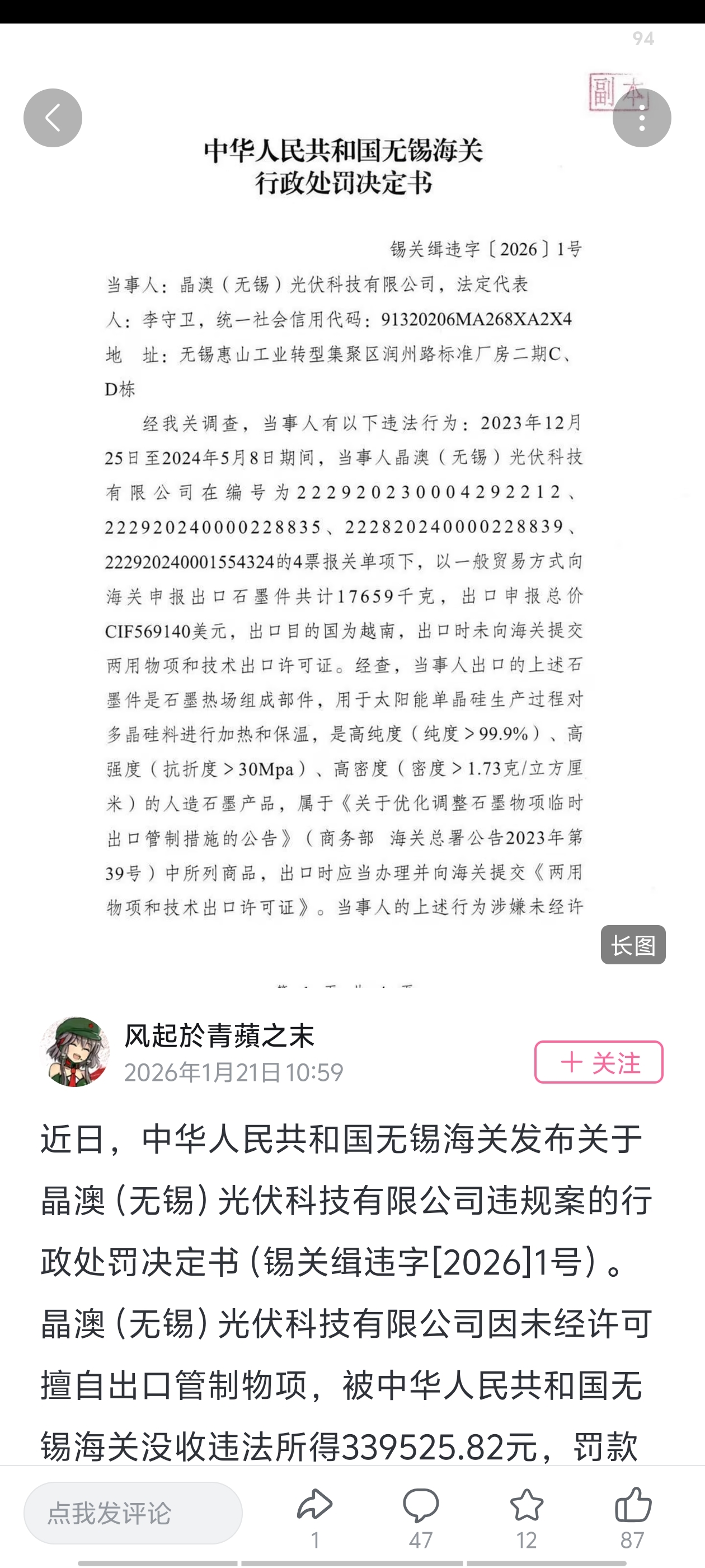 $晶澳科技(SZ002459)$ 近日,中华人民共和国无锡海关发布关于晶澳(无锡)光伏科技有限公司违规案的行政处罚决定书(锡关缉违字[2026]1号)。晶澳(无锡)光伏科技有限公司因未经许可擅自出口管制物项,被中华人民共和国无锡海关没收违法所得339525.82元,罚款130万元。