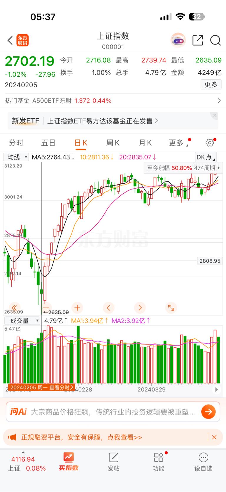 2024年2月5日,上证指数2700、晶澳科技15.42。今天上证指数4100多