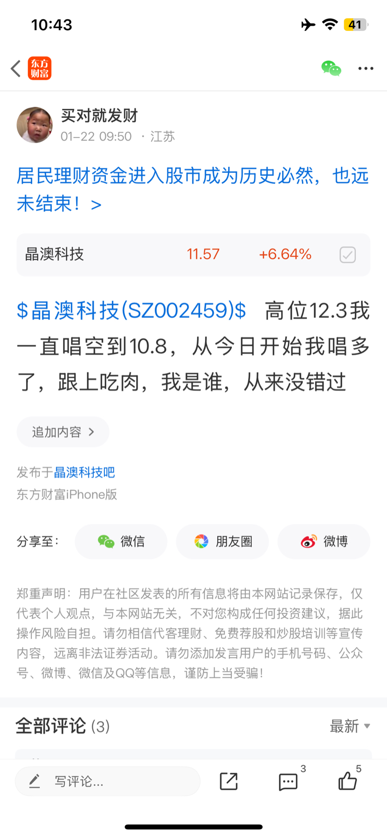 温馨提示: 1.根据《证券法》规定,禁止编造、传播虚假信息或者误导性信息,扰乱证券市场;2.用户在本社区发表的所有资料、言论等仅代表个人观点,与本网站立场无关,不对您构成任何投资建议。用户应基于自己的独立判断,自行决定证券投资并承担相应风险。《东方财富社区管理规定》