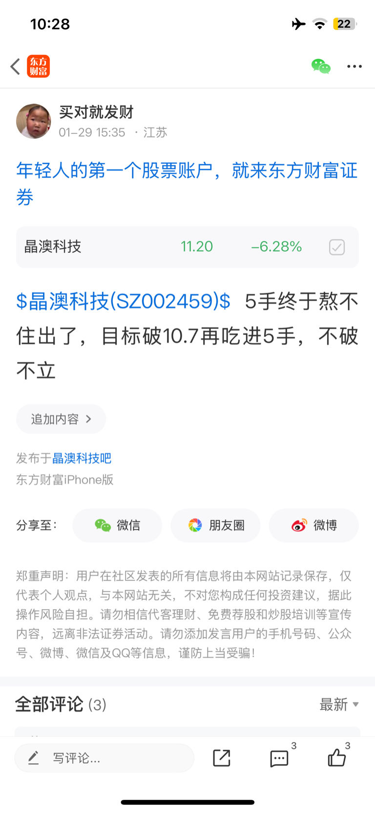 温馨提示: 1.根据《证券法》规定,禁止编造、传播虚假信息或者误导性信息,扰乱证券市场;2.用户在本社区发表的所有资料、言论等仅代表个人观点,与本网站立场无关,不对您构成任何投资建议。用户应基于自己的独立判断,自行决定证券投资并承担相应风险。《东方财富社区管理规定》