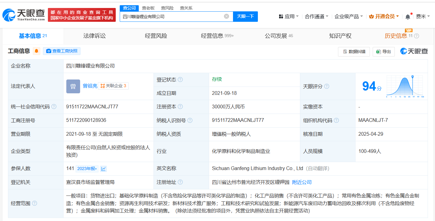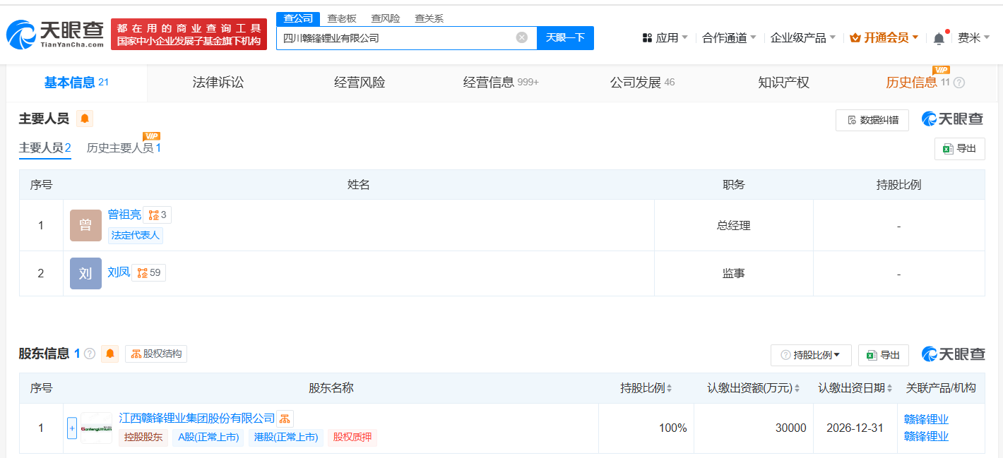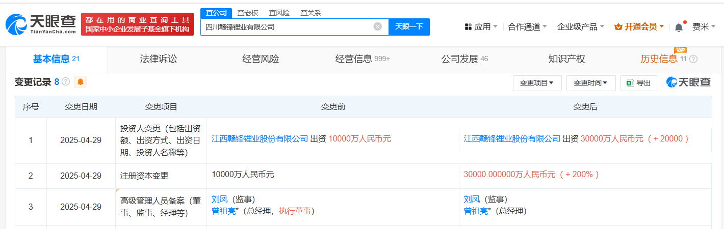 赣锋锂业旗下四川公司增资至3亿元 增幅200%