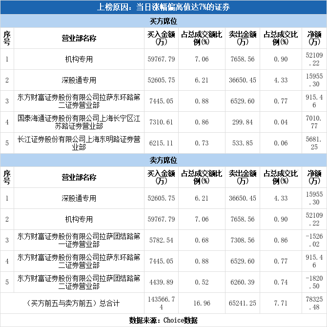 龙虎榜数据显示,今日共2个机构席位出现在龙虎榜单上,分别位列买一、卖二。合计净买入5.21亿元,占龙虎榜净买额的66.53%。
