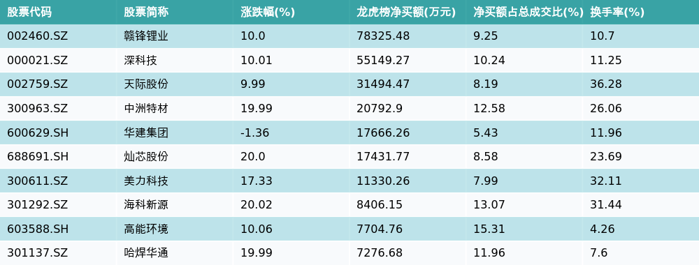 南财智讯10月9日电,南财金融终端数据显示,因当日异动登上龙虎榜的个股中,资金净买入最多的前三位分别是赣锋锂业(002460.SZ)、深科技(000021.SZ)与天际股份(002759.SZ)。其中排名第一的赣锋锂业净买额达7.83亿元,占总成交金额的9.25%。赣锋锂业当日收盘上涨10.0%,换手率为10.7%,净买入额前10个股详情见下图: