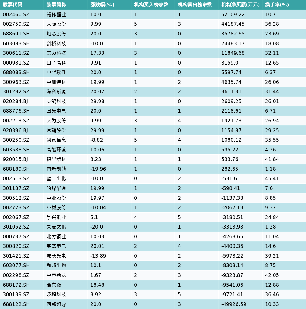 南财智讯10月9日电,南财金融终端数据显示,因当日异动登上龙虎榜的个股中,31只沪深A股龙虎榜出现了机构的身影,机构合计净买入88424.8万元,具体来看,机构净买入17只个股,净卖出14只个股。其中,机构净买入前三分别为赣锋锂业(002460.SZ)、天际股份(002759.SZ)与灿芯股份(688691.SH),详情见下图:机构净卖出的个股中,前三分别为西部超导(688122.SH)、晓程科技(300139.SZ)与燕东微(688172.SH)。