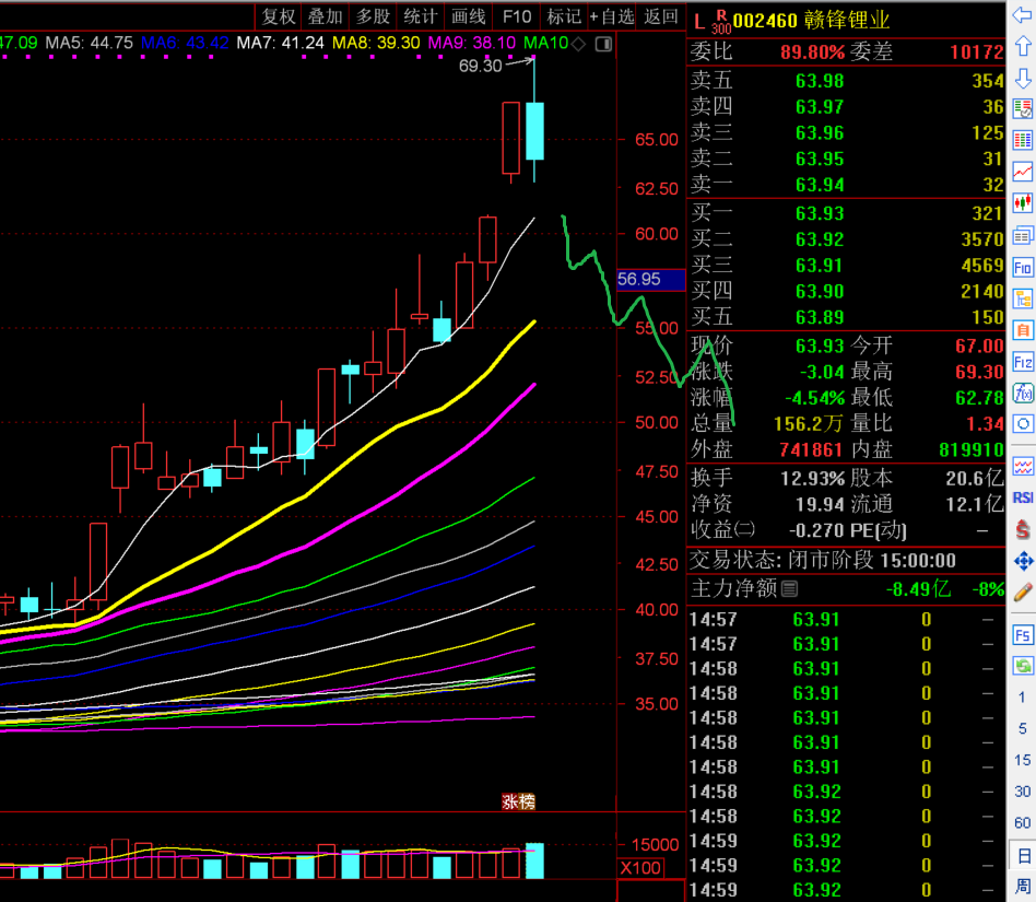 赣锋锂业在69元已见大顶,下周一预计低开百分之六,收盘很可能跌停板,