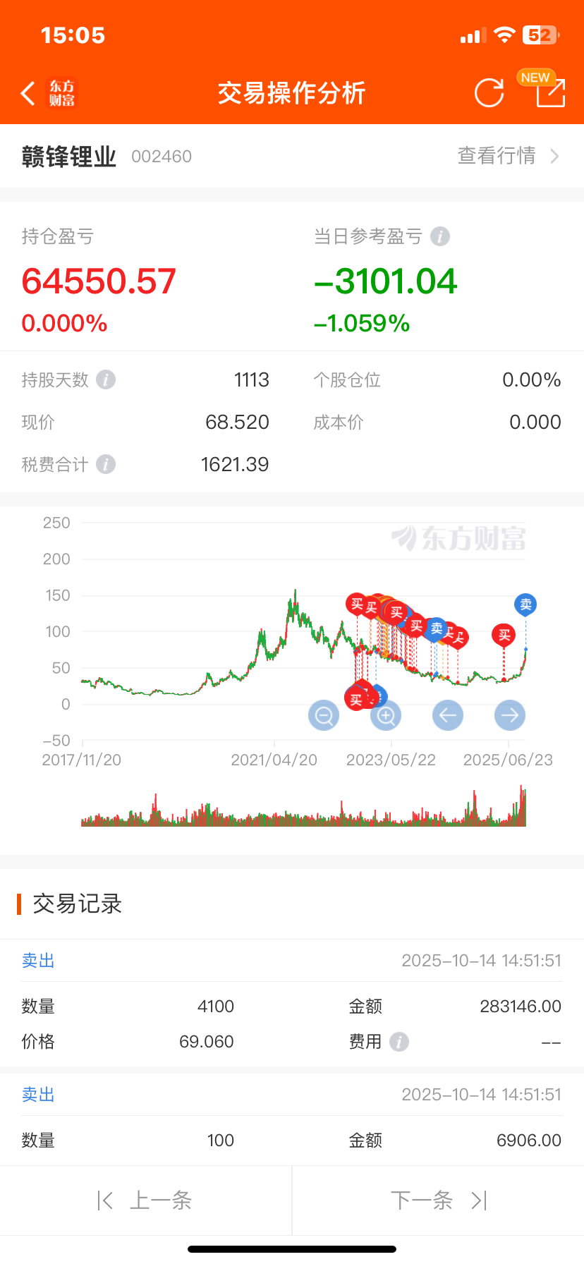 持仓1113天,今天清仓,小挣点,这几年太难熬,虽然清了,但还是看好赣锋未来。祝
