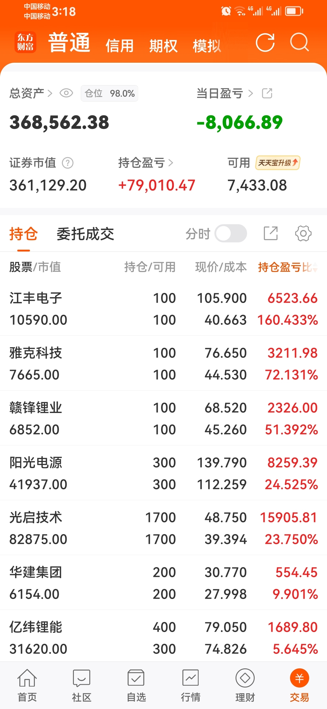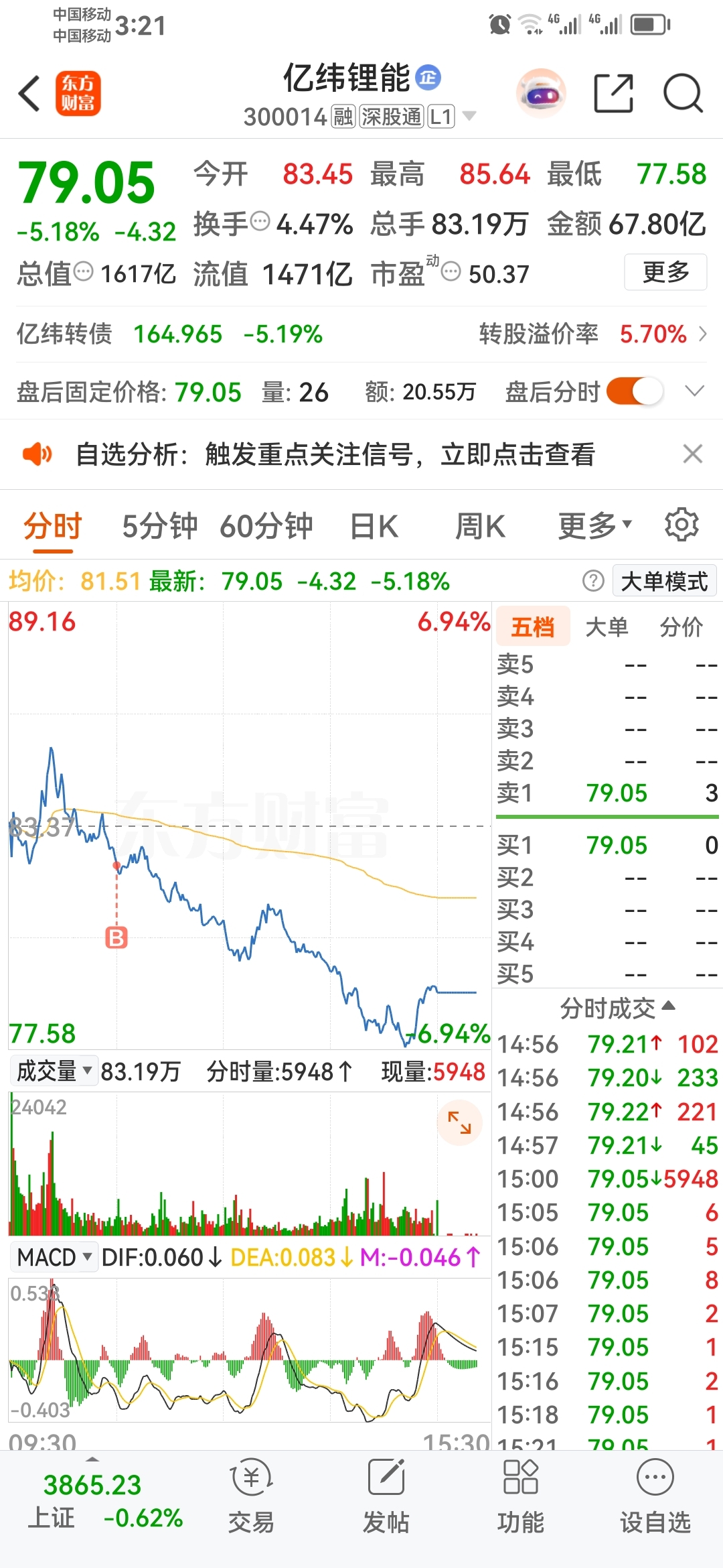 大盘短暂冲高后单边下跌,早盘红得不错,后面绿得厉害,单日跌幅比想象中还要大,亿纬锂能本想做手T,结果买进后单边下跌,没有给出场机会。还挨了通富一个板,大盘长线看好,继续接受短期波动
