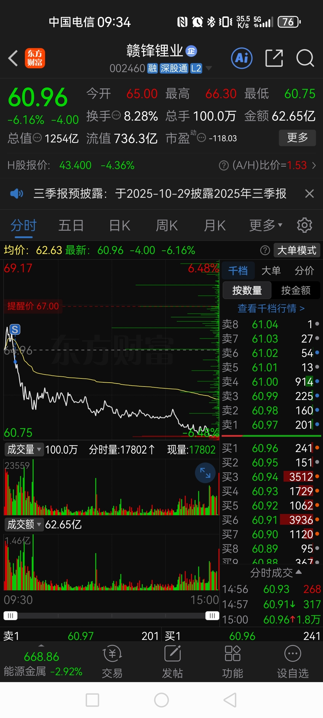 真的是恨自己太贪了,10月份太难做了,赣锋锂业我是63块钱的本,每次开盘都是冲高