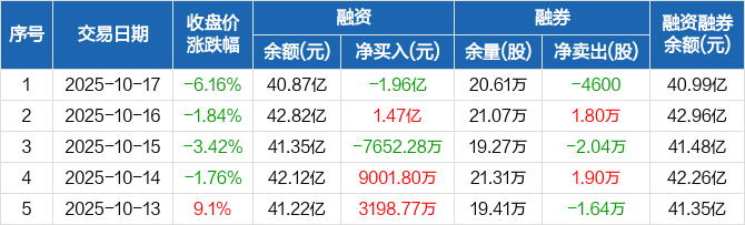 融资方面,当日融资买入5.65亿元,融资偿还7.6亿元,融资净偿还1.96亿元,净偿还额创12个月新高。融券方面,融券卖出2200股,融券偿还6800股,融券余量20.61万股,融券余额1256.63万元。融资融券余额合计40.99亿元。