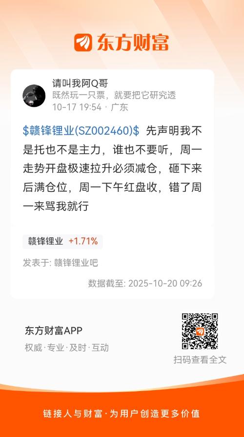 $赣锋锂业(SZ002460)$ 先声明我不是托也不是主力,谁也不要听,周一走势开盘极速拉升必须减仓,砸下来后满仓位,周一下午红盘收,错了周一来骂我就行