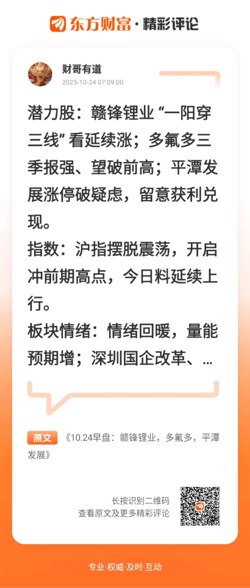 //@财哥有道 :潜力股:$赣锋锂业(SZ002460)$ “一阳穿三线” 看延续涨;$多氟多(SZ002407)$三季报强、望破前高;$平潭发展(SZ000592)$涨停破疑虑,留意获利兑现。指数:沪指摆脱震荡,开启冲前期高点,今日料延续上行。板块情绪:情绪回暖,量能预期增;深圳国企改革、煤炭为主线,能源金属等或轮动。持仓复盘:深科技逆势亮眼已介入;赛力斯看关键位、楚江新材等板块带动;卧龙电驱盯 45 元支撑,破则撤。