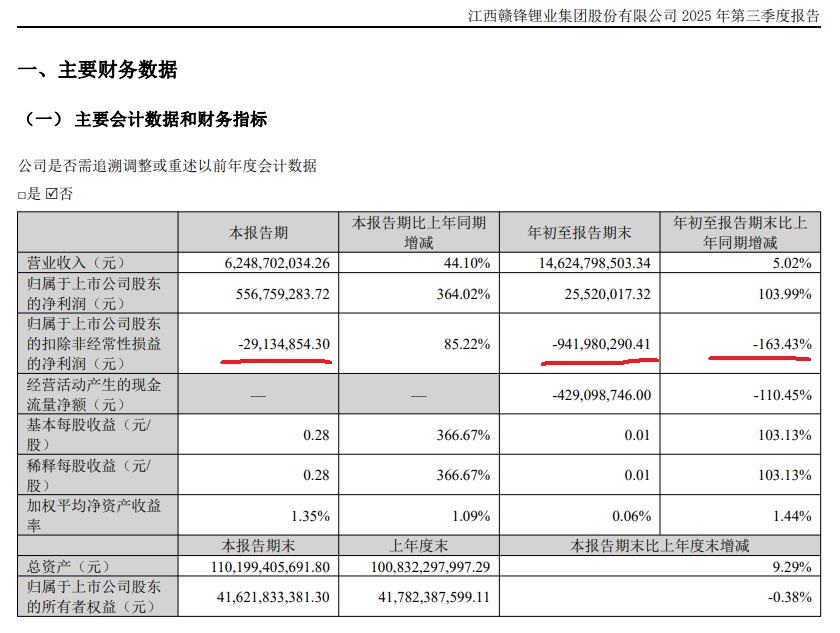 很多散户对企业经营分析一窍不通,看企业经营只看净利润,那是错误的。不管是机构投资还是财务分析,对于一个企业经营实际能力情况要看扣非净利润。赣峰锂业在三季度业绩表面向好的情况下,居然实质扣非净利润比去年还亏损多近6亿,业绩同比还下降163.43%,股票拉这么多这么高,居然这样的业绩那是不可想象的。