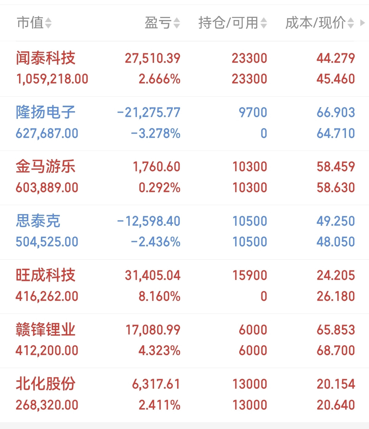 $赣锋锂业(SZ002460)$ $北化股份(SZ002246)$ $旺成科技(SZ920896)$ 闻泰科技 金马游乐 思泰克 隆杨电子继续持有