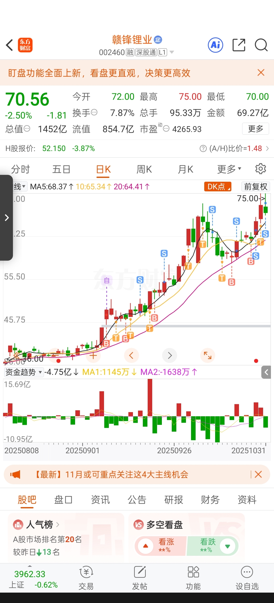$赣锋锂业(SZ002460)$ 早晨73.99清仓了走了,留下的发财!