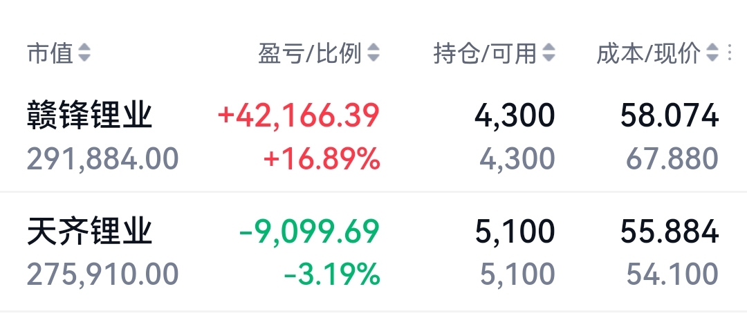 $赣锋锂业(SZ002460)$ 每日一贴,上次发持仓是10号,仅过去两天,持股赣锋和天齐一股没动亏损2.5W,长期看好,但亏的厉害就立场,每日默念高抛低吸三遍