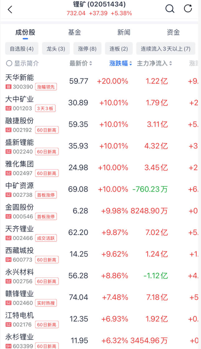 受此影响,午后锂矿概念股涨势扩大,多只个股集体涨停。