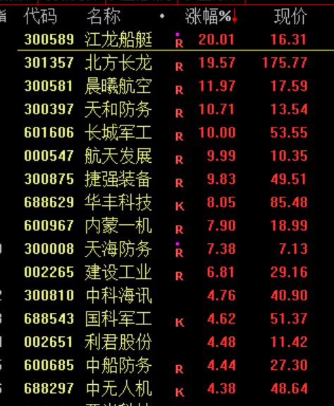 军工板块盘中拉升,江龙船艇、航天发展等封板。