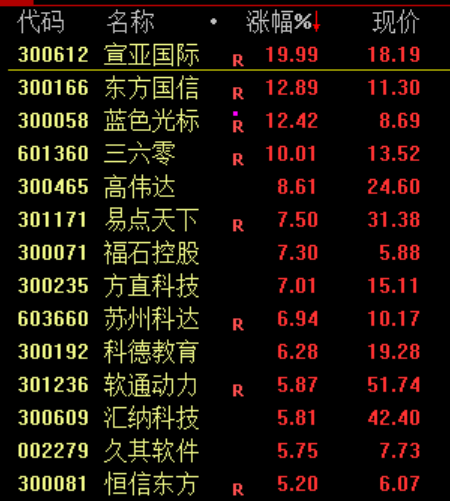 AI应用方向表现活跃,三六零、宣亚国际等涨停。