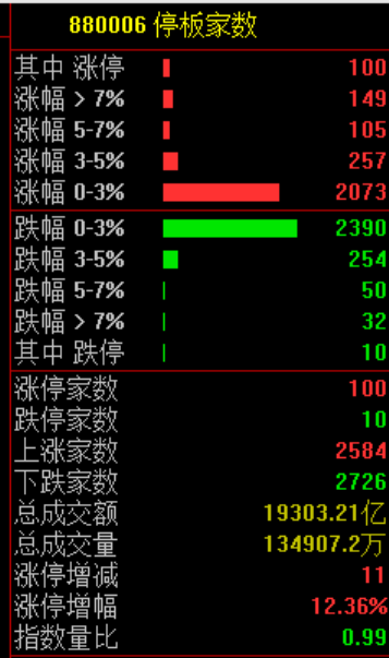 市场共2584只个股上涨,100只个股涨停,2726只个股下跌。