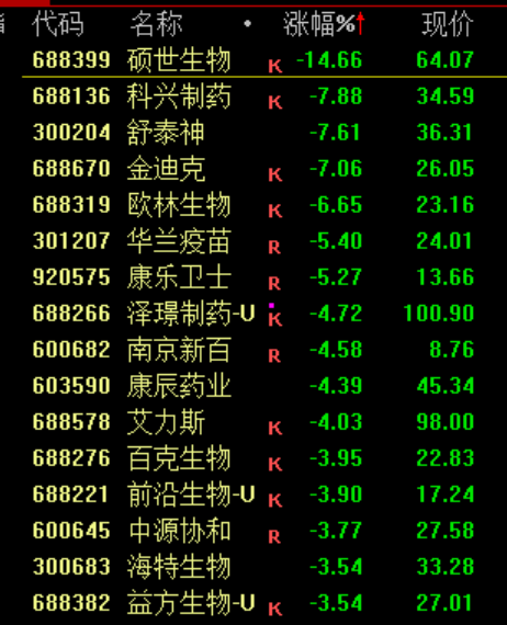 下跌方面,医药股集体调整,硕世生物跌超10%。