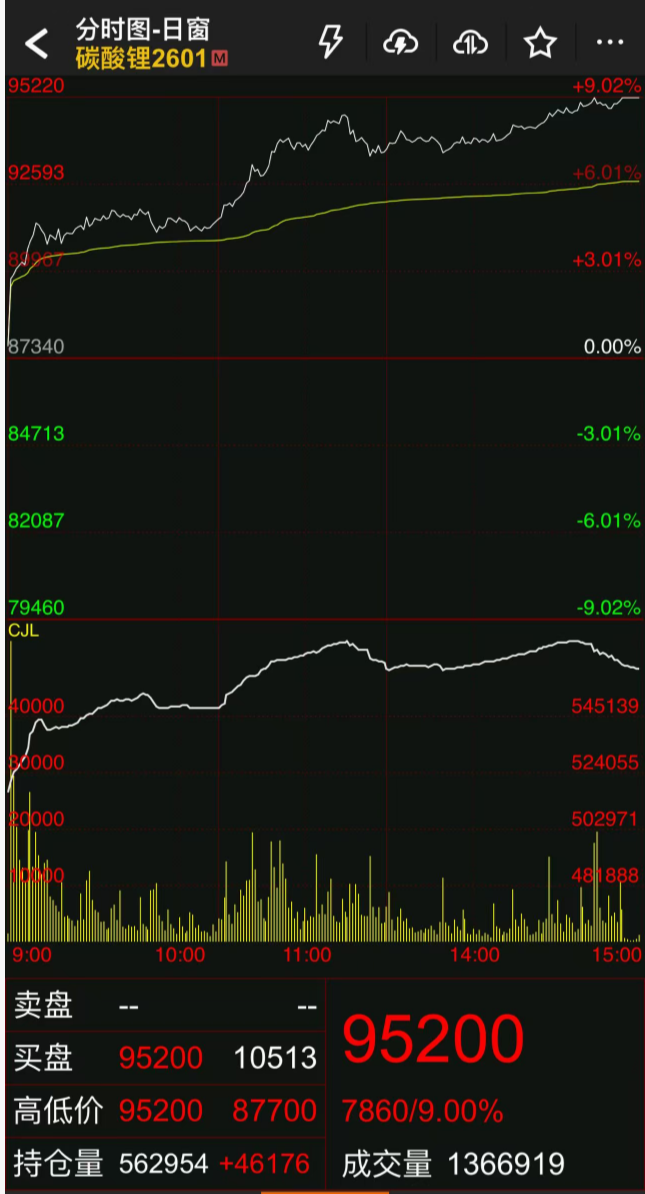 11月17日,碳酸锂期货主力合约触及涨停,涨幅达9%,报95200元/吨,创2024年7月以来新高。