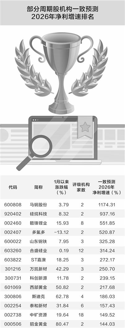 据数据宝统计,机构一致预测显示,在有色、化工、石油石化、钢铁等周期板块中,获两家及以上机构评级、 且2025年净利润预测为正的个股中,有20只2026年净利润有望大幅增长超100%。