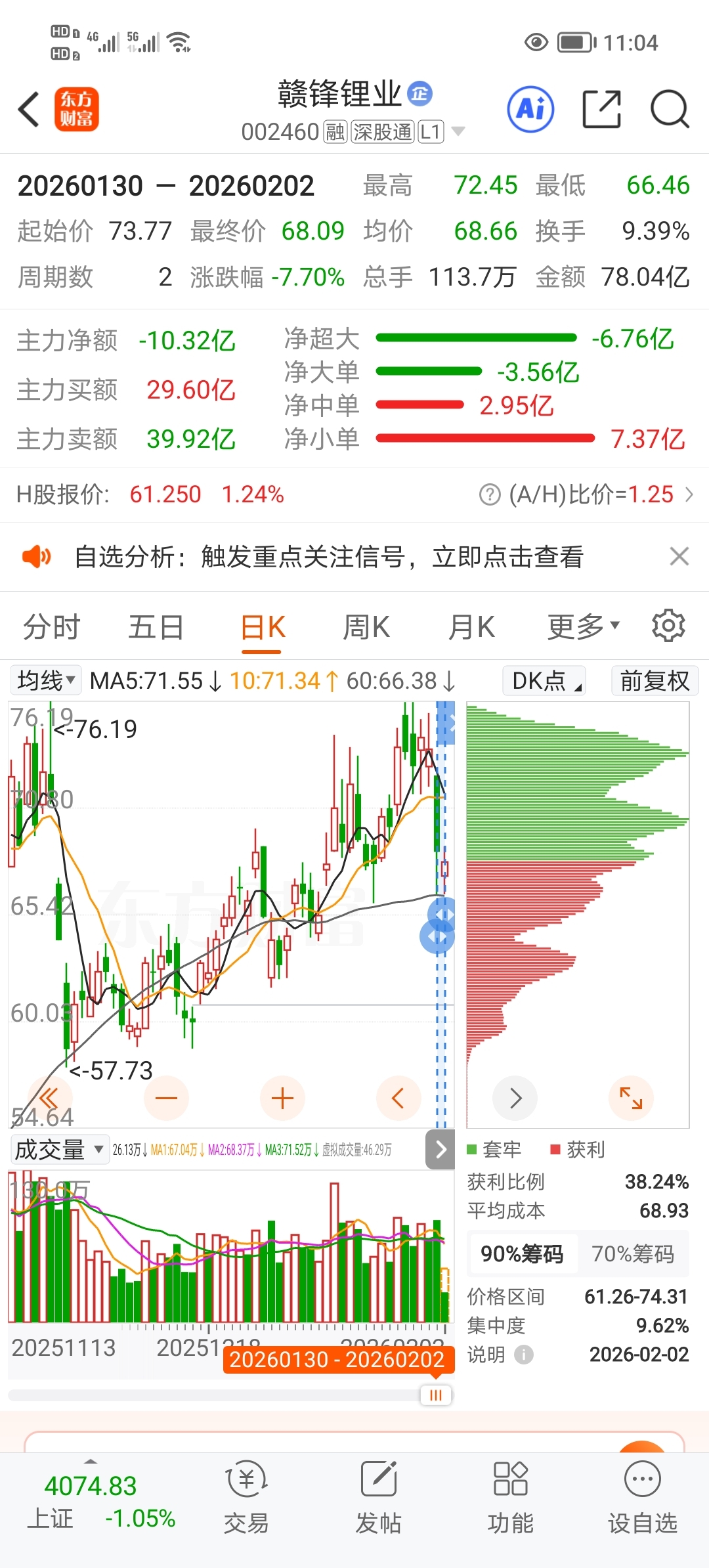 $赣锋锂业(SZ002460)$ $不深调不加仓,前几次都是破了60日线后启稳,再等一会,看下午走势,这次调整主力丢了筹码,散户好多补了仓,主力比我们急呀!