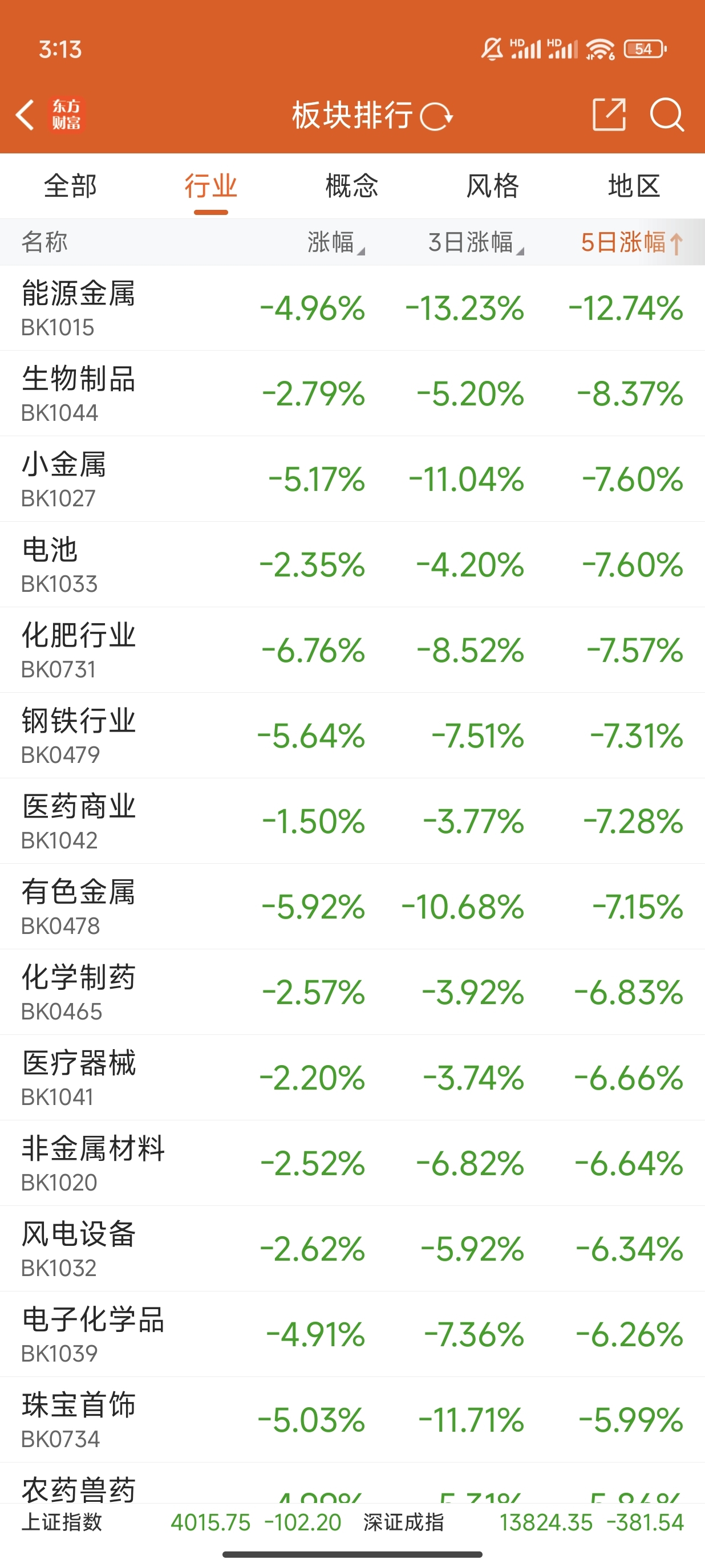 $天齐锂业(SZ002466)$ $赣锋锂业(SZ002460)$ 天齐金业,赣锋银业,能源金属板块3日和5日涨幅都是倒数第一,涨的时候排不进前五,跌起来就是第一