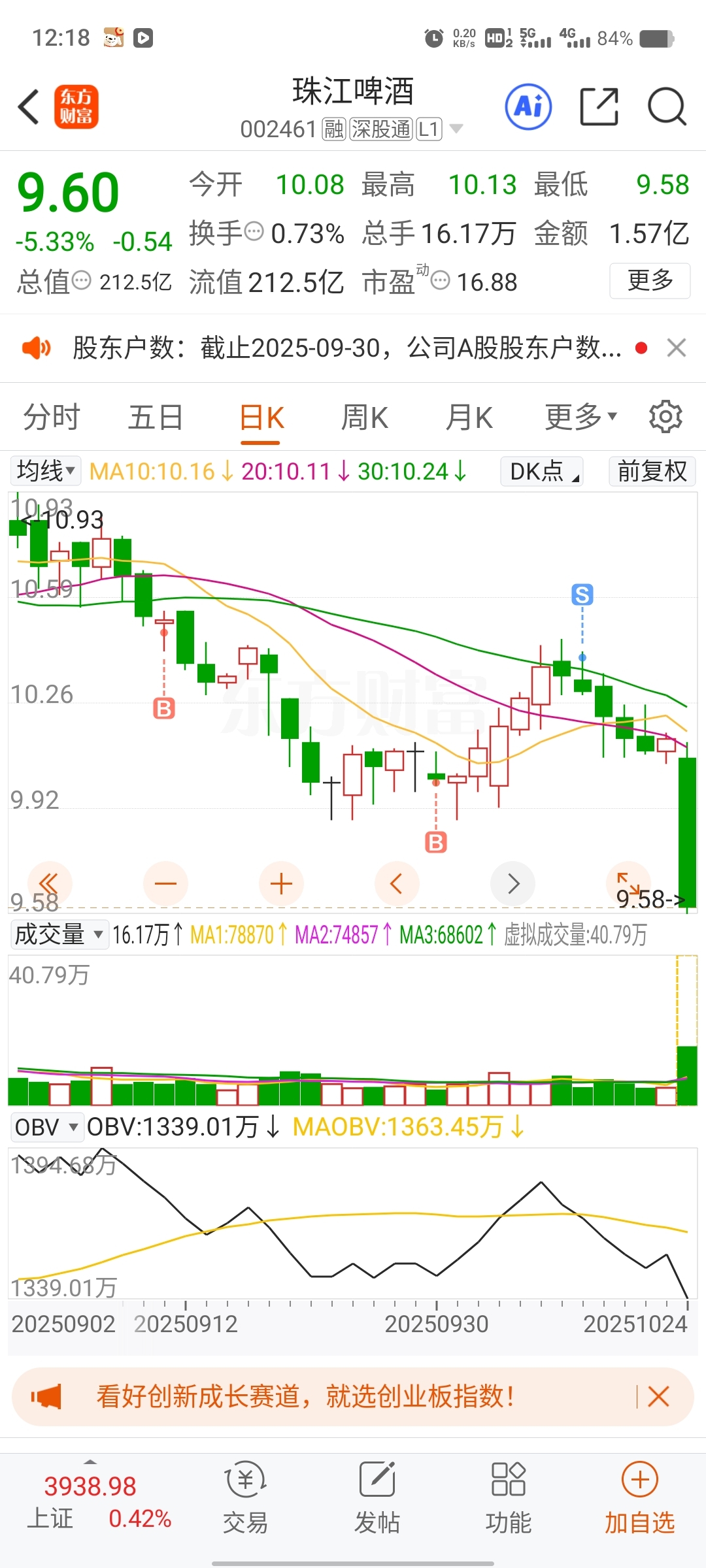$珠江啤酒(SZ002461)$ 卖了,又买回,亏2个多点,大跌不可能不买的!