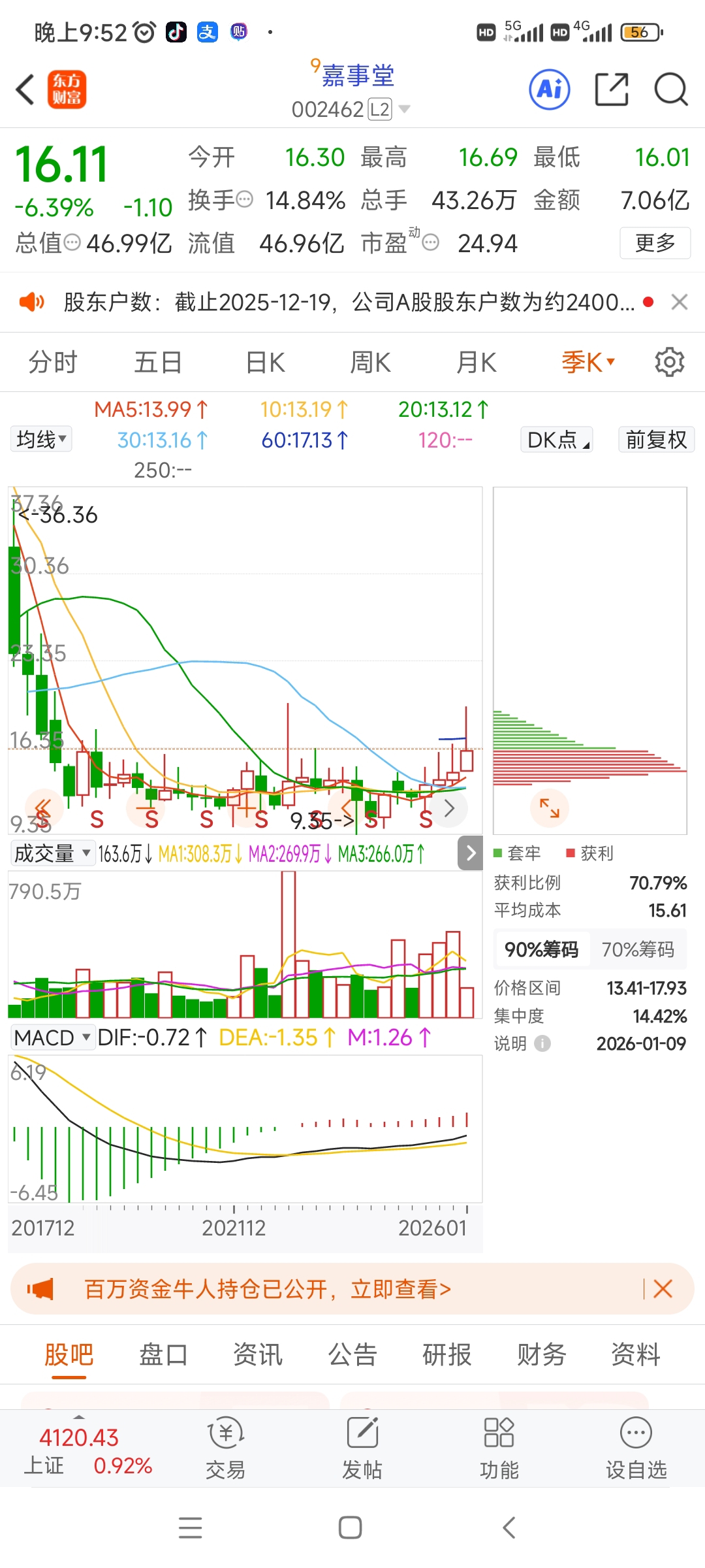 $嘉事堂(SZ002462)$ 从19.69跌下来都快4块钱了,大周期的老庄绝对还在,人家敢打压这么多幅度,那么继续打到15以下都是稀松平常的事,何况5季线甚至还不到14块钱,先下去摸了5季线,再调头猛攻站稳60季线,都不会破坏大周期的趋势,别拿自己的钱不当钱,抄急跌的底,不比逃急涨的顶简单