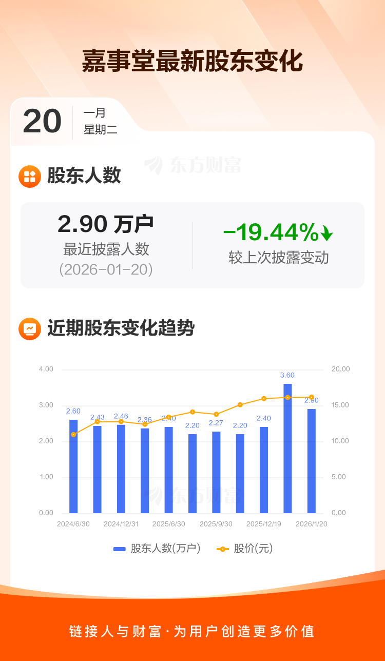 嘉事堂最新披露数据显示,截至1月20日公司股东户数为2.90万户,较上期(2026年1月9日)减少7000户,降幅为19.44%。户均持有流通股数量由上期的8096股上升至1.01万股,户均持股金额由上期的13.04万元增加至16.22万元。