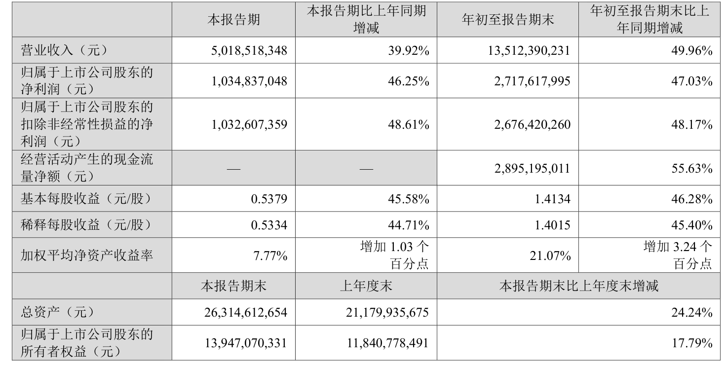 中证智能财讯沪电股份(002463)10月29日披露2025年第三季度报告。前三季度公司实现营业总收入135.12亿元,同比增长49.96%;归母净利润27.18亿元,同比增长47.03%;扣非净利润26.76亿元,同比增长48.17%;经营活动产生的现金流量净额为28.95亿元,同比增长55.63%;报告期内,沪电股份基本每股收益为1.4134元,加权平均净资产收益率为21.07%。