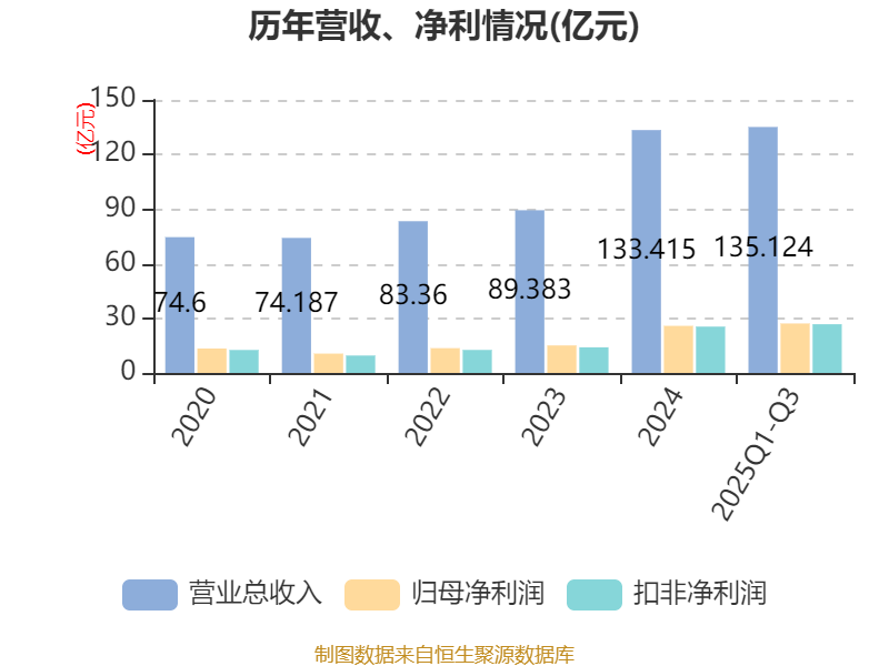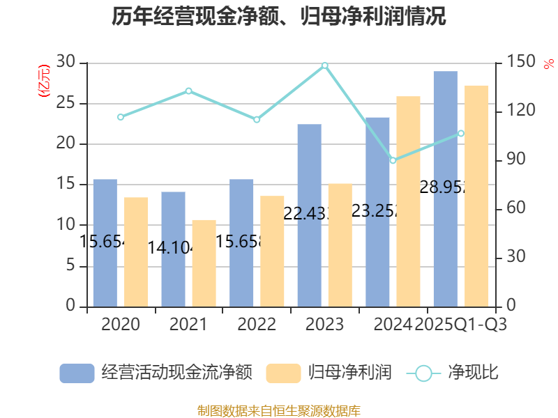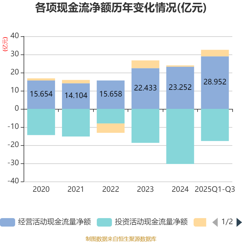 2025年前三季度,公司经营活动现金流净额为28.95亿元,同比增长55.63%;筹资活动现金流净额3.6亿元,同比增加4.42亿元;投资活动现金流净额-17.69亿元,上年同期为-13.93亿元。