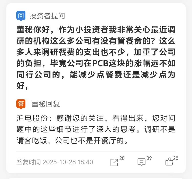 “董秘你好,作为小投资者,我非常关心最近调研的机构这么多,公司有没有管餐食的?这么多人来调研餐费的支出也不少,加重了公司的负担。”10月28日,有投资者在互动平台向沪电股份(002463)提出这样一个看似琐碎却实际的问题。
