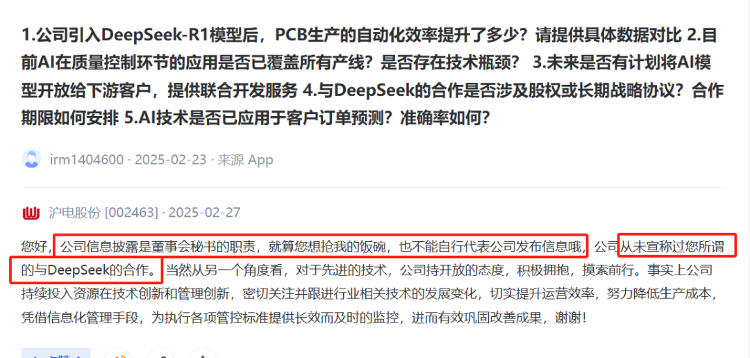 从回应投资者建议公司蹭deepseek热点时的“既无心为之,也不屑去学”,到回答公司是否考虑收购英伟达时的直接否定,沪电股份董秘的互动风格在A股市场中独树一帜。