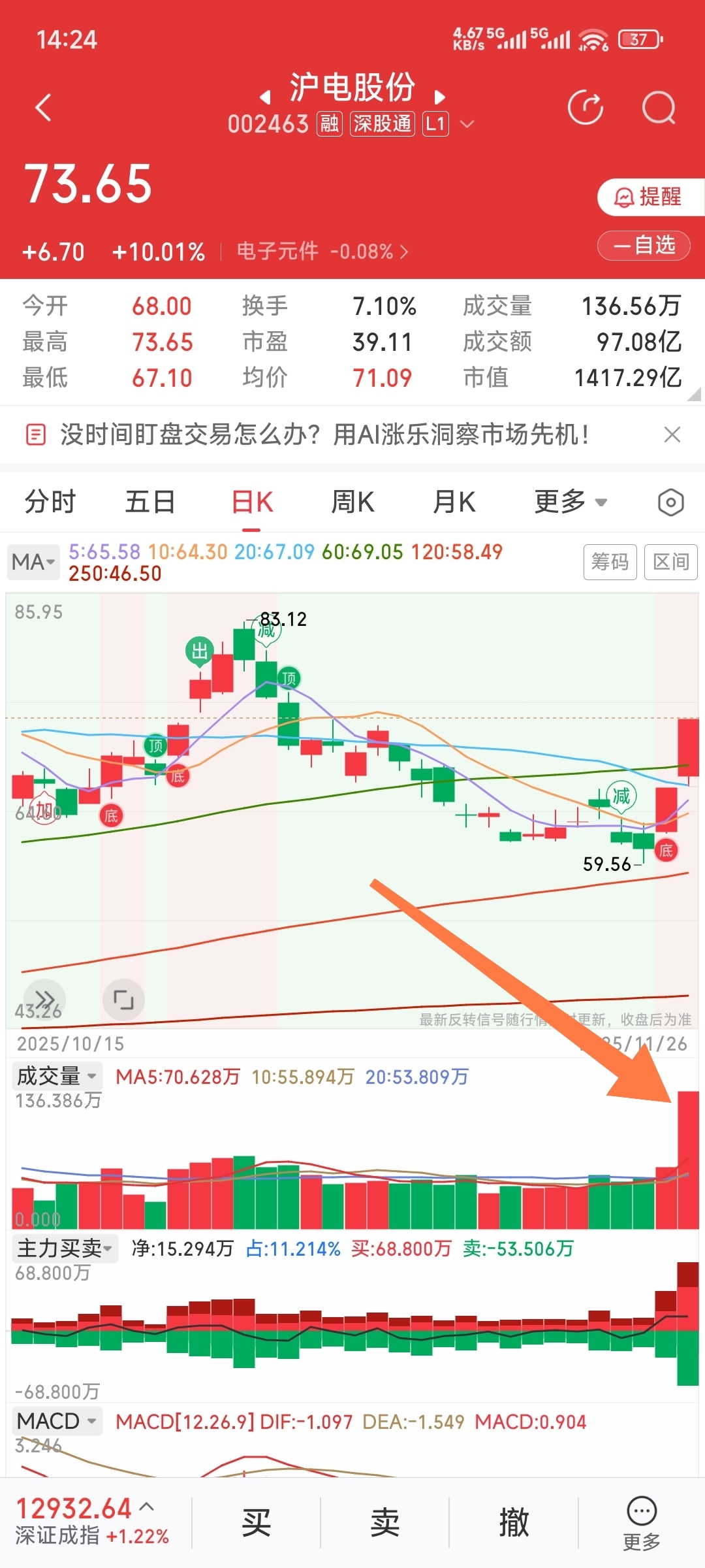 $沪电股份(SZ002463)$ 放量两倍,明天会怎样?