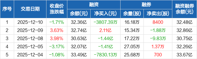 沪电股份:融资净偿还3807.39万元,融资余额32.36亿元(12-10)