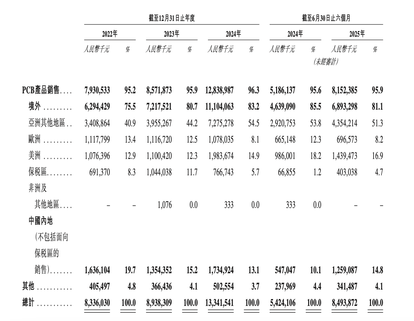 另一方面,公司的业绩高增长主要由PCB、AI服务器等产品驱动,AI服务器/HPC、交换机/路由器与智能汽车电子化/智能化等领域目前的景气度较高,但技术路线和市场需求的未来变化可能影响增长的可持续性。并且,申请版本文件披露,报告期内公司境外销售收入占比分别为75.5%、80.7%、83.2%和81.1%,占比较大,因此公司经营可能受到国际关系、关税与贸易争端、制裁或出口限制、海外经济状况等因素影响。
