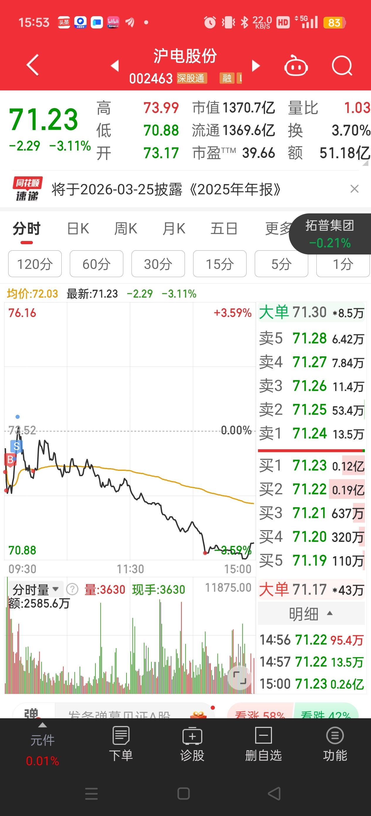 $沪电股份(SZ002463)$ 如前天预期正三角形不上则下,力度逐渐加强,复位前平台意向,既然向下先看力度的延续性和手法,前面采用的都是间隔式震荡,如果手法延续,明天如果低开2个点内,大概率会反抽小阳,或上下影收敛小K线此种走法只建立在资金惜筹!另一种可不友好,各位自行脑补,以上觉纯属扯淡