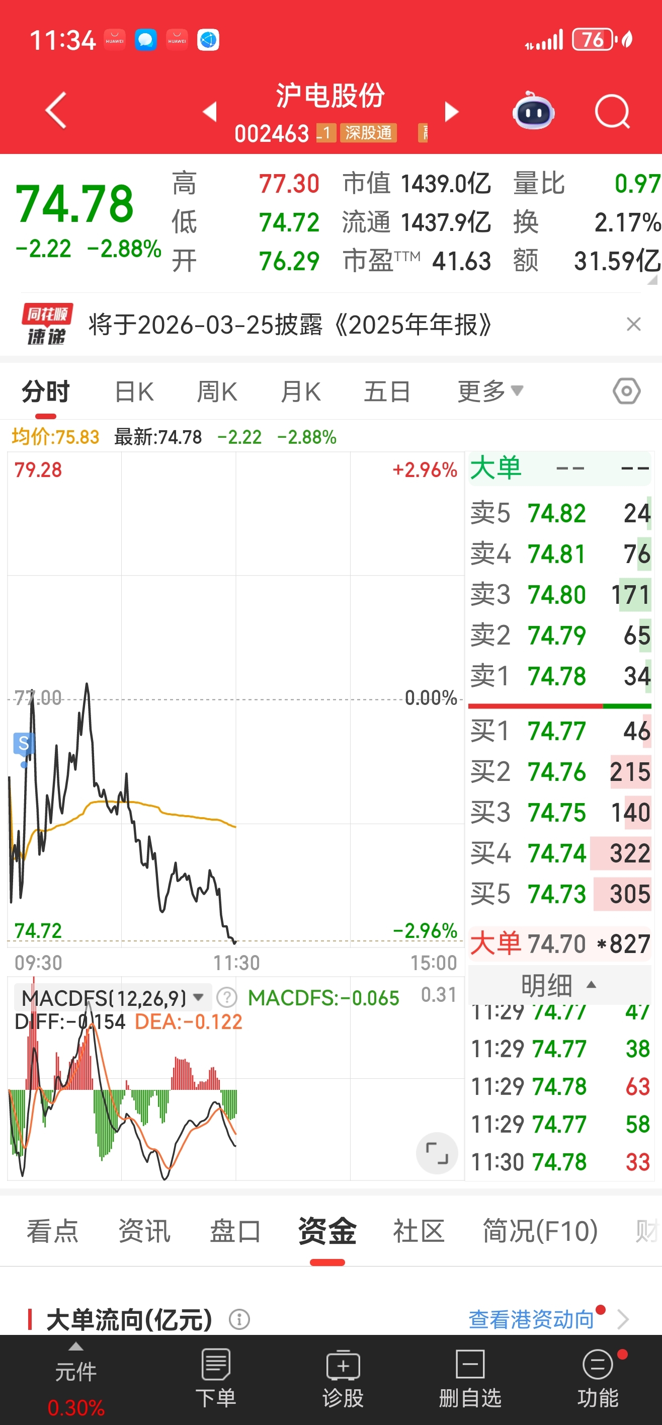 $沪电股份(SZ002463)$ 今天76.40走了,尾盘看看接回来