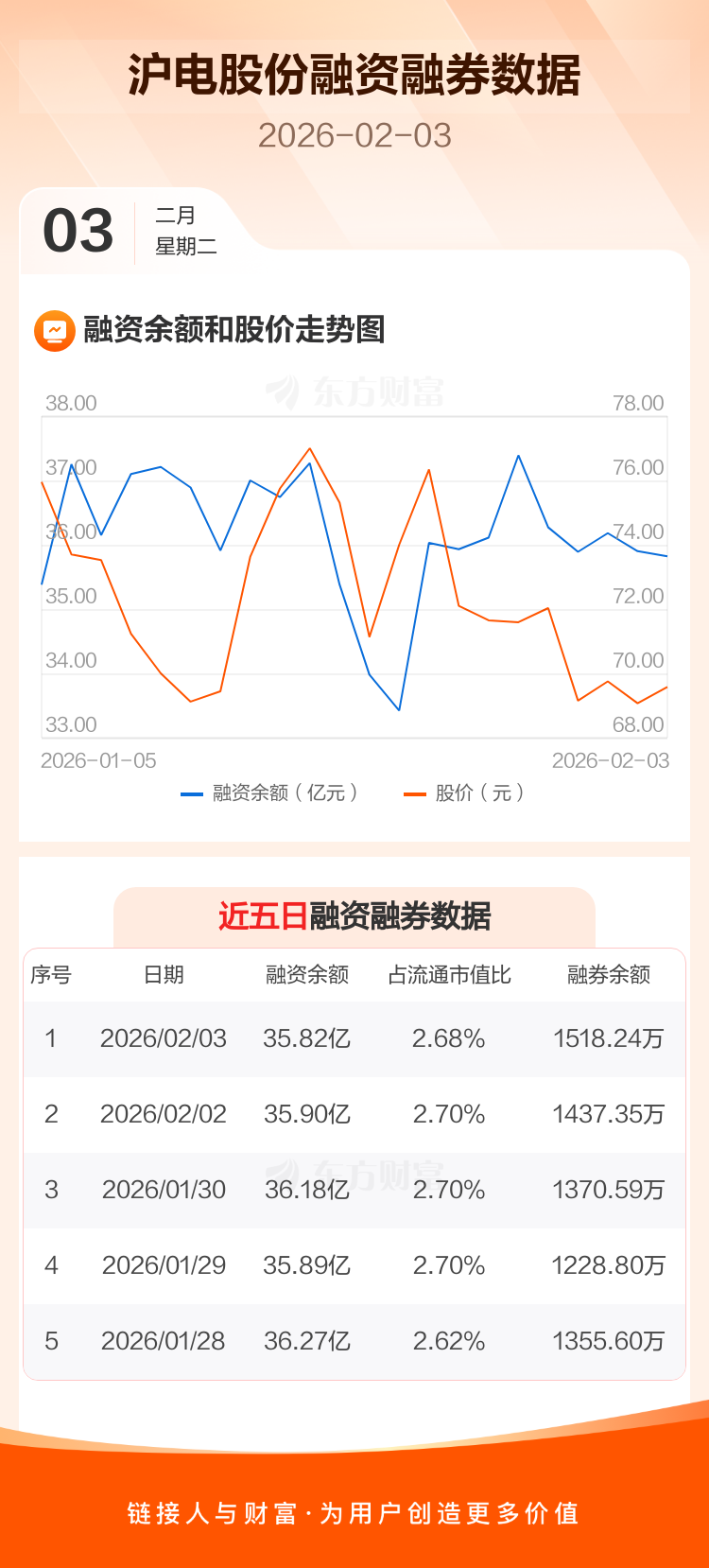 交易所最新数据显示,沪电股份于2026年2月3日获融资买入3.01亿元,融资偿还3.08亿元,当日融资净偿还736.09万元。目前,该股融资余额35.82亿,占流通市值比例为2.68%。