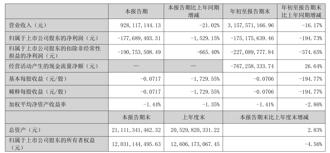 第三季度,公司营业收入为9.28亿元,同比下降21.02%;归母净利润亏损1.78亿元,同比大降1529.15%;扣非净利润亏损1.91亿元,同比下降665.40%。值得一提的是,公司上半年仍有约251万元的盈利。